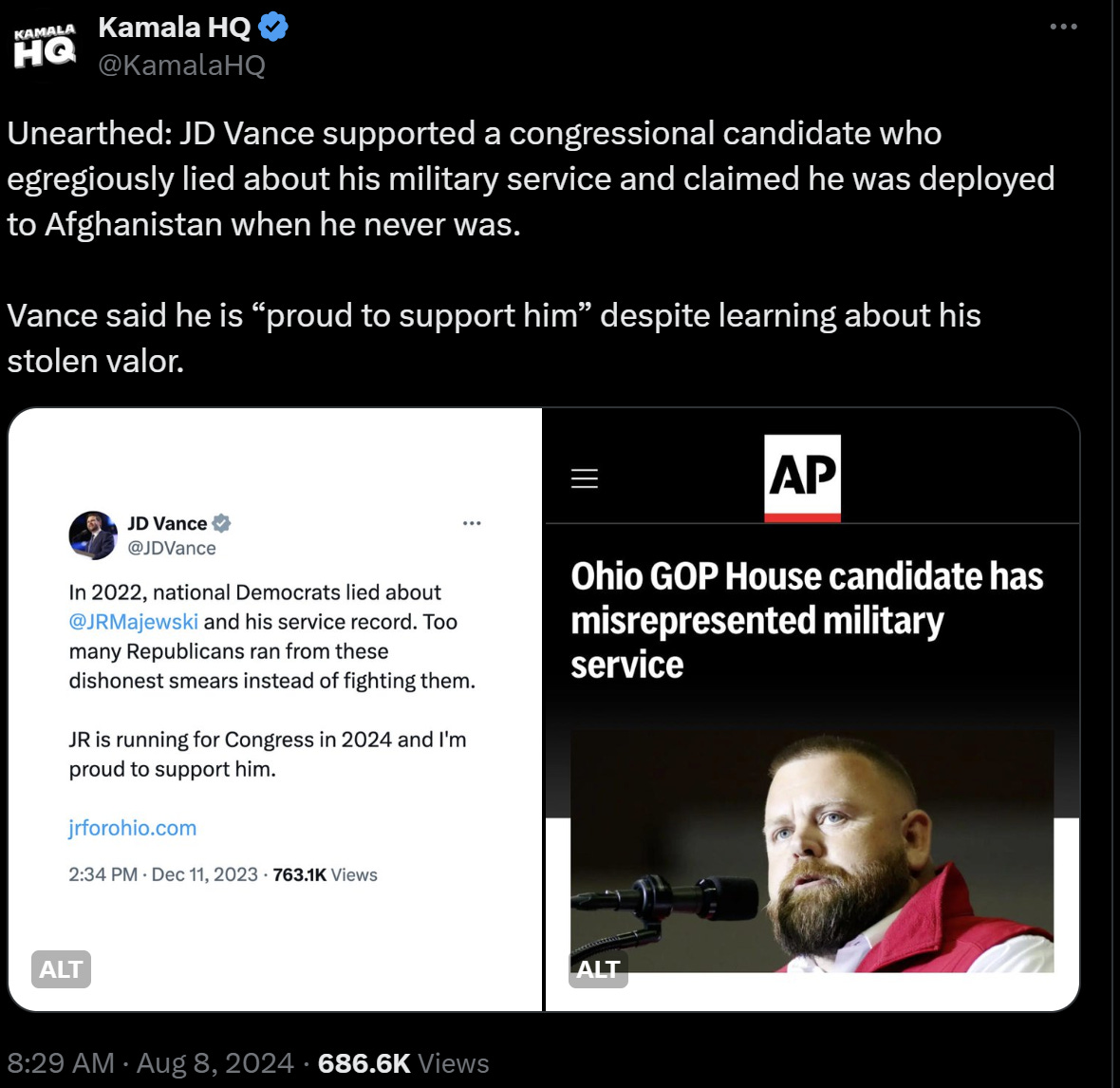 The irony of all this is that the person who has in fact openly supported a candidate who actually lied about being in Afghanistan is J. D. Vance.